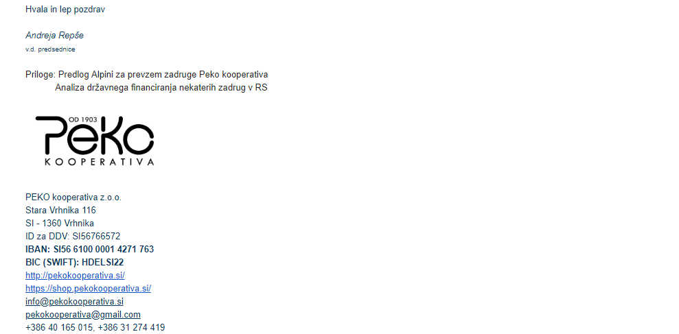 Prepričani smo, da se boste na naš predlog pozitivno odzvali in boste morda pri pisanju nove strategije oziroma novega poslovnega načrta za Alpino našli v naših predlogih kaj kar bo tudi lažja pot za Alpino in zdaj tudi za Peko z.o.o. do novih sredstev, ki so na voljo v bankah.